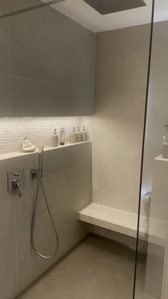 Ebenerdige Dusche, harmonisch abgestimmter Waschtisch mit passendem Unterschrank und ein durchdachtes Raumkonzept.